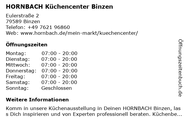 | Öffnungszeiten HORNBACH Küchencenter Binzen in Binzen anzeigen | |