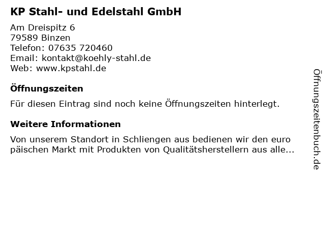 | Öffnungszeiten KP Stahl- und Edelstahl GmbH in Binzen anzeigen | |