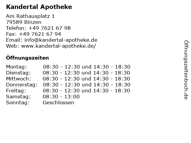 | Öffnungszeiten Kandertal Apotheke in Binzen anzeigen | |