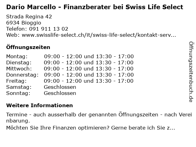 3 Oscar Scolari - Finanzberater bei Swiss Life Select (Entfernung: 0,01 km) Strada Regina 42, 6934 Bioggio 4 Nicholas Butti - Führungskraft bei Swiss Life Select (Entfernung: 0,01 km) Strada Regina 42, 6934 Bioggio 5 Angelo Ghitti - Finanzberater bei Swiss Life Select (Entfernung: 0,01 km) Strada Regina 42, 6934 Bioggio 6 Lorenzo Cavallina - Finanzberater bei Swiss Life Select (Entfernung: 0,01 km) Strada Regina 42, 6934 Bioggio |