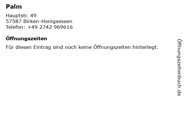 | Öffnungszeiten Palm in Birken-Honigsessen anzeigen | |