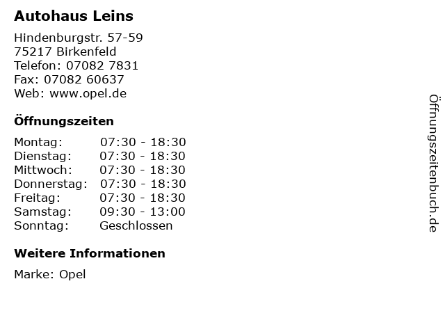 | Öffnungszeiten Autohaus Leins in Birkenfeld anzeigen | |