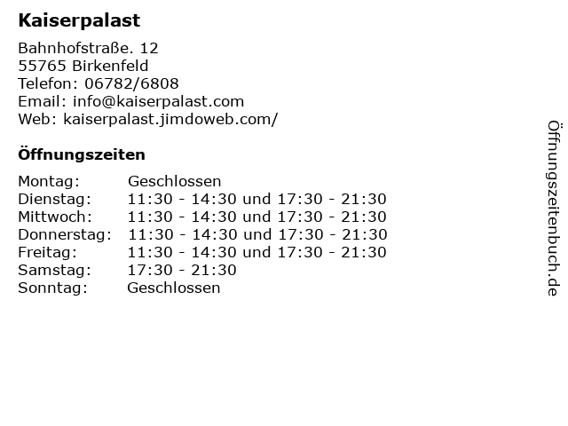 | Öffnungszeiten Kaiserpalast in Birkenfeld anzeigen | |