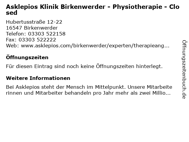 | Asklepios Klinik Birkenwerder - Physiotherapie - Closed anrufen | |