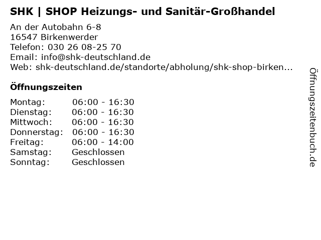 1 SHK | SHOP Heizungs- und Sanitär-Großhandel (Entfernung: 9,91 km) Im Gewerbepark 40, 16727 Oberkrämer 3 SHK | SHOP Heizungs- und Sanitär-Großhandel (Entfernung: 18,39 km) An der Spreeschanze 10-12, 13599 Berlin 4 Feinkost Casdorf Import Großhandel Handelsvertretungen GmbH (Entfernung: 7,95 km) Welfenallee 57, 13465 Berlin 5 BGT Gas und Öl- Technik GmbH Heizungs- und Lüftungsbau (Entfernung: 10,30 km) Dr.-R.-Weber-Str. 10, 16727 Oberkrämer 6 SHK-Beratung Sven Hunnius & Katja Hunnius GbR, Küchen ? Planung, Beratung & Vertrieb (Entfernung: 12,54 km) Veitstr. 32 a, 13507 Berlin |