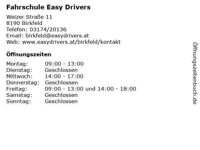 | Öffnungszeiten Fahrschule Easy Drivers in Birkfeld anzeigen | |