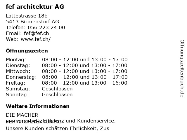 | Öffnungszeiten fef architektur AG in Birmenstorf AG anzeigen | |