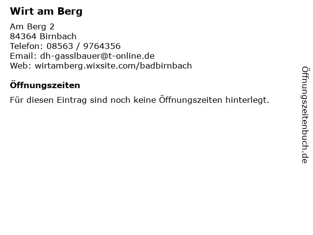| Öffnungszeiten Wirt am Berg in Birnbach anzeigen | |