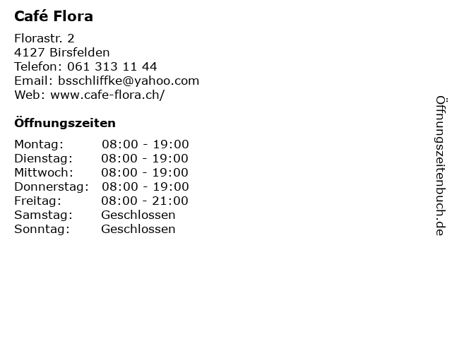 | Öffnungszeiten Café Flora in Birsfelden anzeigen | |
