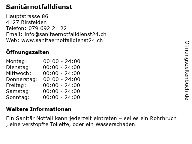 | Öffnungszeiten Sanitärnotfalldienst in Birsfelden anzeigen | |