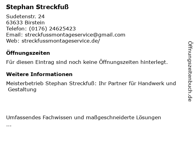 | Öffnungszeiten Stephan Streckfuß in Birstein anzeigen | |