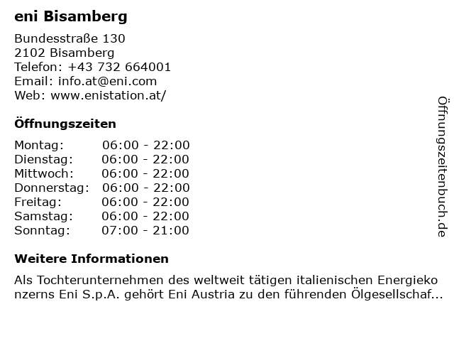 | Öffnungszeiten eni Bisamberg in Bisamberg anzeigen | |