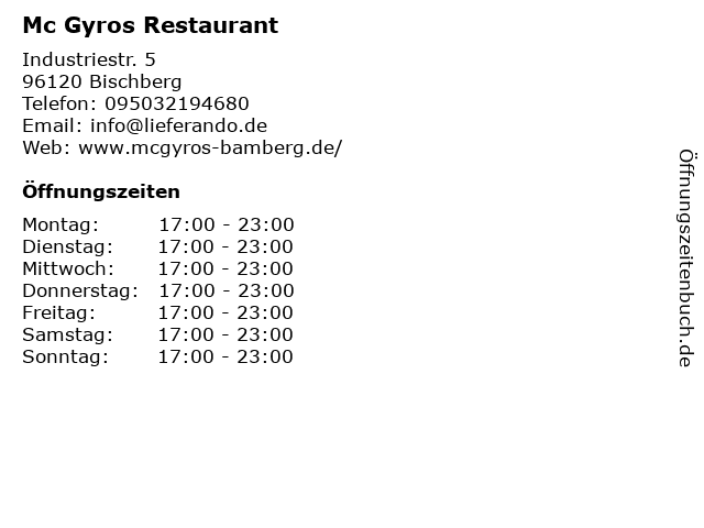 | Öffnungszeiten Mc Gyros Restaurant in Bischberg anzeigen | |
