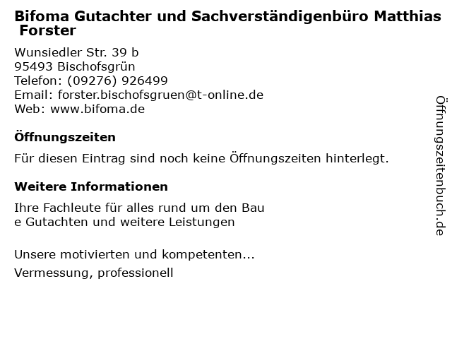 | Bifoma Gutachter und Sachverständigenbüro Matthias Forster anrufen | |