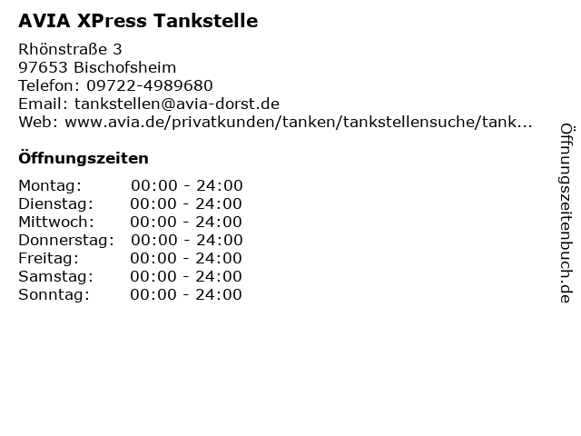 | Öffnungszeiten AVIA XPress Tankstelle in Bischofsheim anzeigen | |