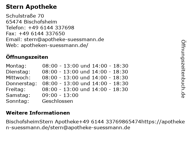 | Öffnungszeiten Stern Apotheke in Bischofsheim anzeigen | |