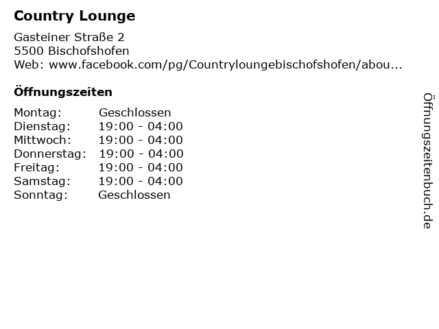 | Öffnungszeiten Country Lounge in Bischofshofen anzeigen | |