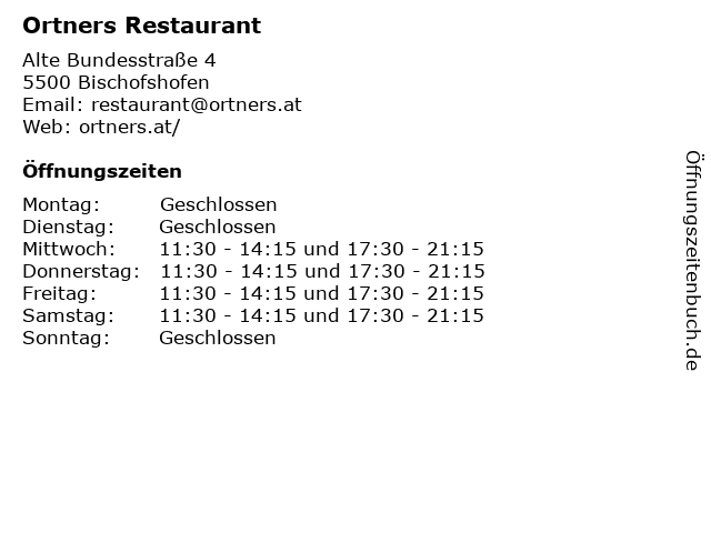 | Öffnungszeiten Ortners Restaurant in Bischofshofen anzeigen | |
