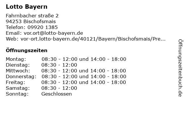 | Öffnungszeiten Lotto Bayern in Bischofsmais anzeigen | |