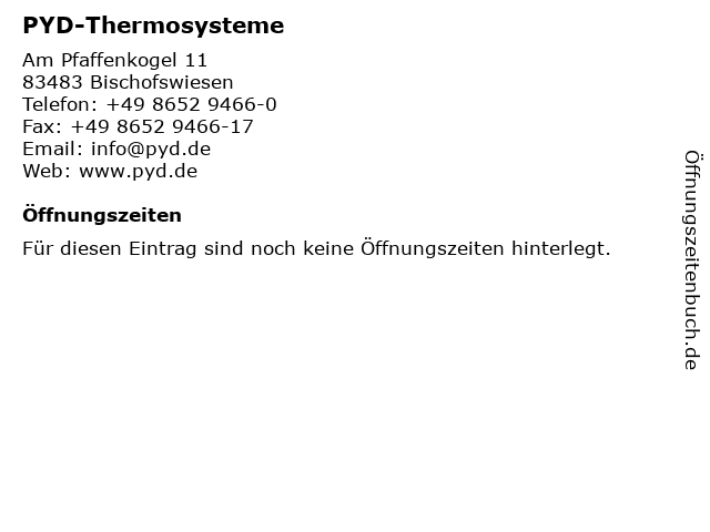 Öffnungszeiten PYD-Thermosysteme in Bischofswiesen anzeigen | |