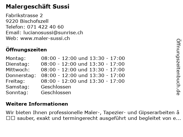 | Öffnungszeiten Malergeschäft Sussi in Bischofszell anzeigen | |