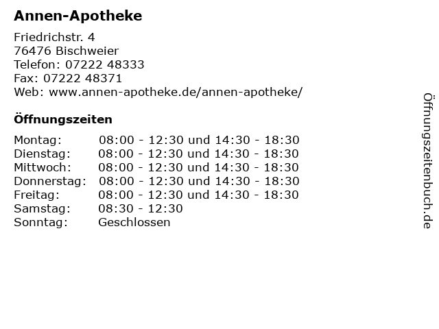 | Öffnungszeiten Annen-Apotheke in Bischweier anzeigen | |