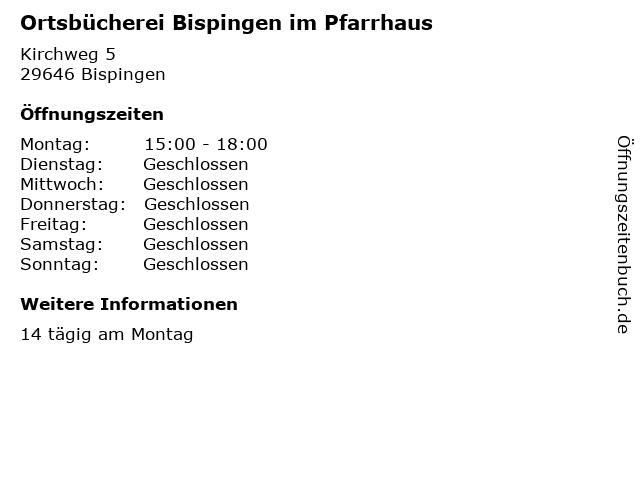 | Öffnungszeiten Ortsbücherei Bispingen im Pfarrhaus in Bispingen anzeigen | |