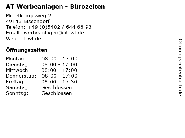 Branchen & Suchbegriffe zu AT Werbeanlagen - Bürozeiten:at, bürozeiten, kommunikation, marketing, werbe, werbeanlagen, werbetechnik |