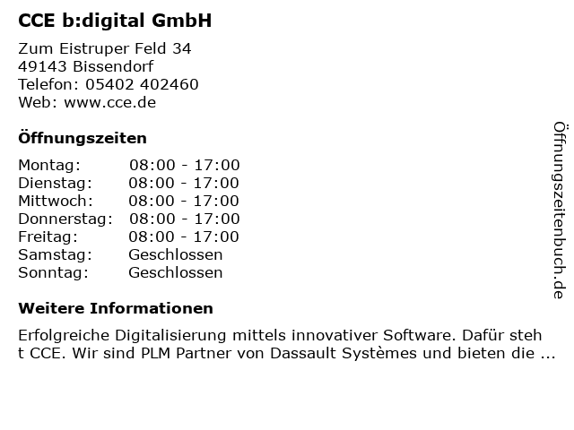 | Öffnungszeiten CCE b:digital GmbH in Bissendorf anzeigen | |