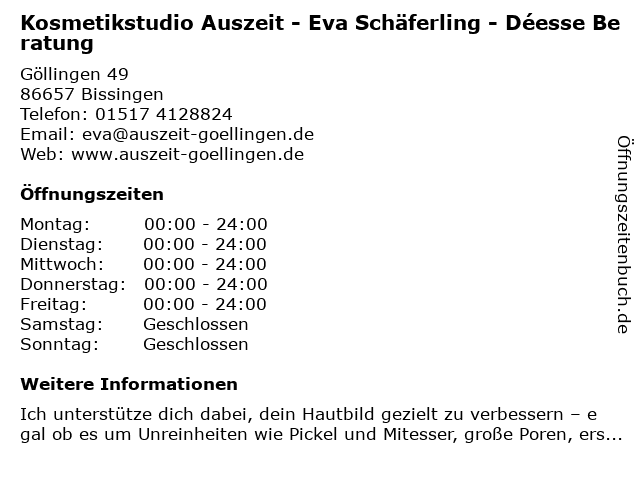 Branchen & Suchbegriffe zu Kosmetikstudio Auszeit - Eva Schäferling - Déesse Beratung:auszeit, beratung, déesse, eva, haarentfernung: waxing, kosmetikstudio, schäferling, spa, visagist |