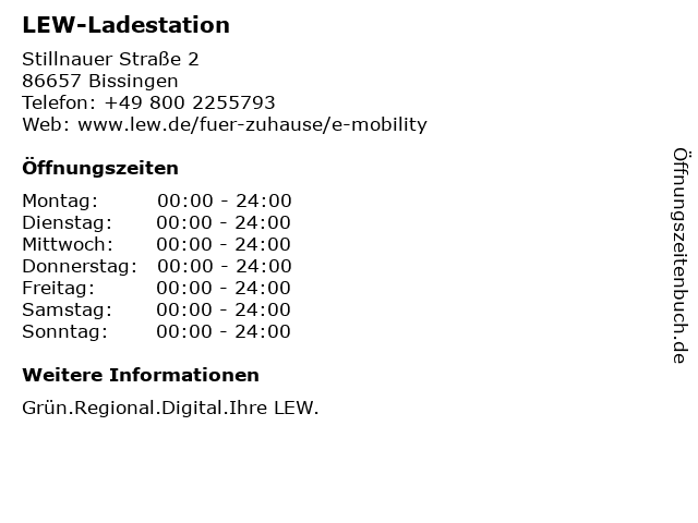 | Öffnungszeiten LEW-Ladestation in Bissingen anzeigen | |