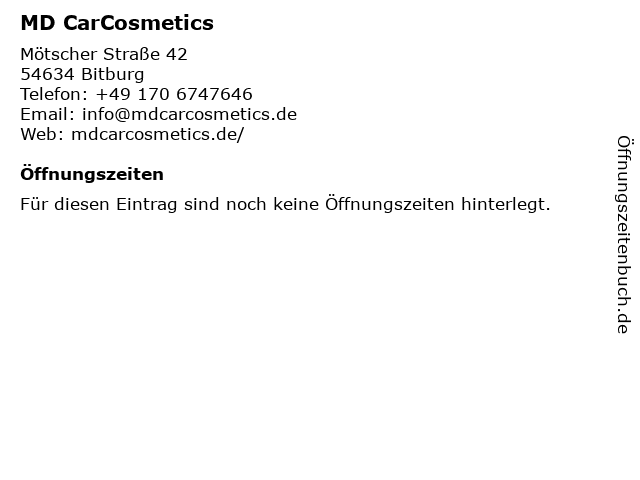 | Öffnungszeiten MD CarCosmetics in Bitburg anzeigen | |