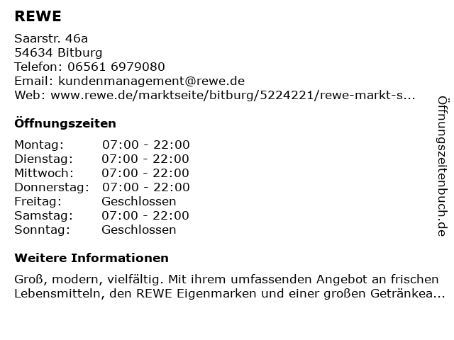 | Öffnungszeiten REWE in Bitburg anzeigen | |