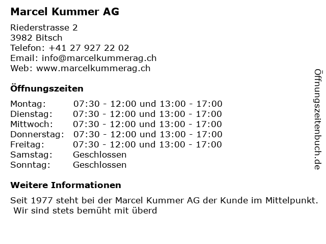 | Öffnungszeiten Marcel Kummer AG in Bitsch anzeigen | |