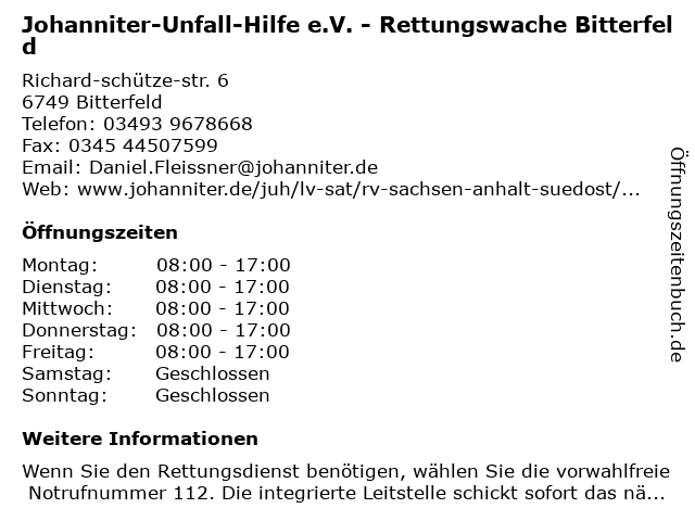 Branchen & Suchbegriffe zu Johanniter-Unfall-Hilfe e.V. - Rettungswache Bitterfeld:e.v., gemeinnützige organisation, hilfe, hilfsorganisation, johanniter, rettungswache, sozialarbeit, unfall, verband, wohlfahrtseinrichtung |