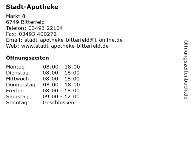 | Öffnungszeiten Stadt-Apotheke in Bitterfeld anzeigen | |