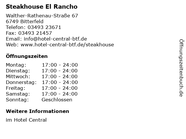 | Öffnungszeiten Steakhouse El Rancho in Bitterfeld anzeigen | |