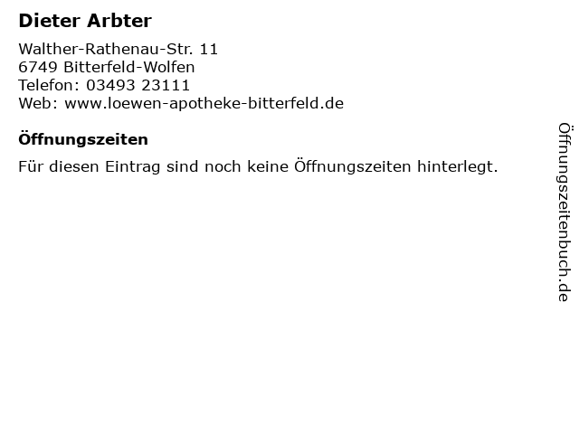 | Öffnungszeiten Dieter Arbter in Bitterfeld-Wolfen anzeigen | |