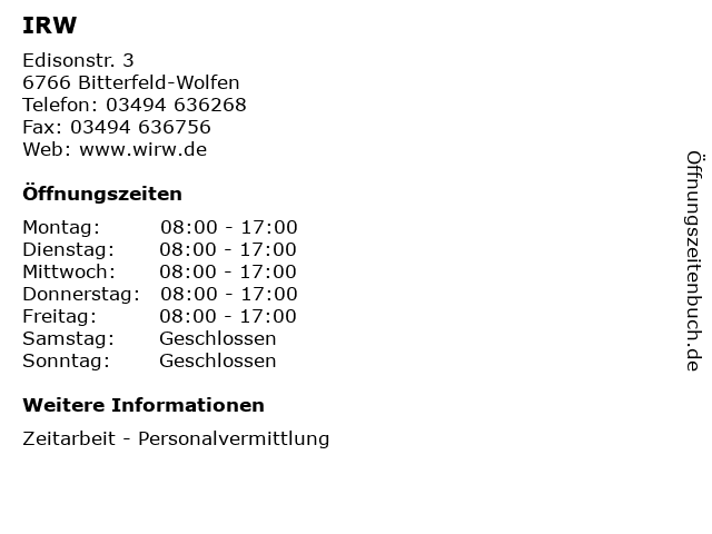 | Öffnungszeiten IRW in Bitterfeld-Wolfen anzeigen | |