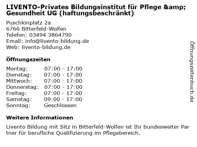 Branchen & Suchbegriffe zu LIVENTO-Privates Bildungsinstitut für Pflege & Gesundheit UG (haftungsbeschränkt):bildungsinstitut, gesundheit, haftungsbeschränkt, livento, pflege, privates, ug |