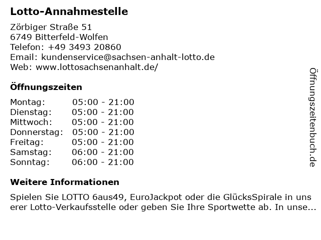 1 Lotto-Annahmestelle (Entfernung: 1,90 km) Walter-Rathenau-Straße 52, 06749 Bitterfeld-Wolfen OT Bitterfel 6 |