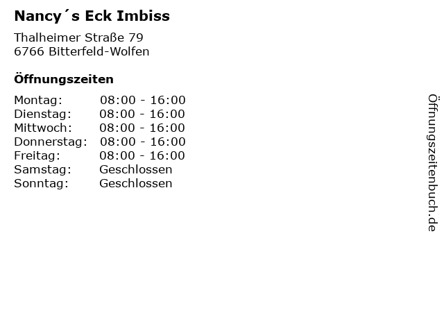 | Öffnungszeiten Nancy´s Eck Imbiss in Bitterfeld-Wolfen anzeigen | |