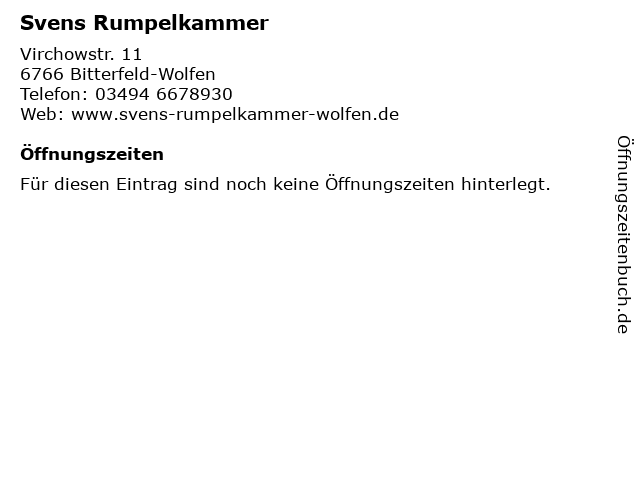 | Öffnungszeiten Svens Rumpelkammer in Bitterfeld-Wolfen anzeigen | |