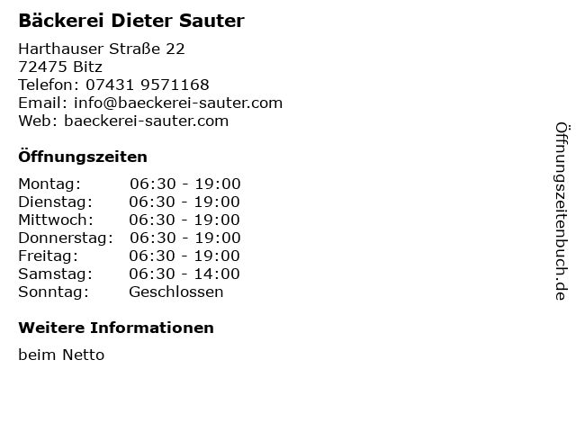 | Öffnungszeiten Bäckerei Dieter Sauter in Bitz anzeigen | |
