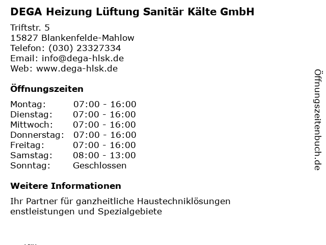 1 DEWA Kälte und Klimatechnik (Entfernung: 3,25 km) Dahlewitzer Dorfstraße 2, 15827 Blankenfelde-Mahlow 6 |