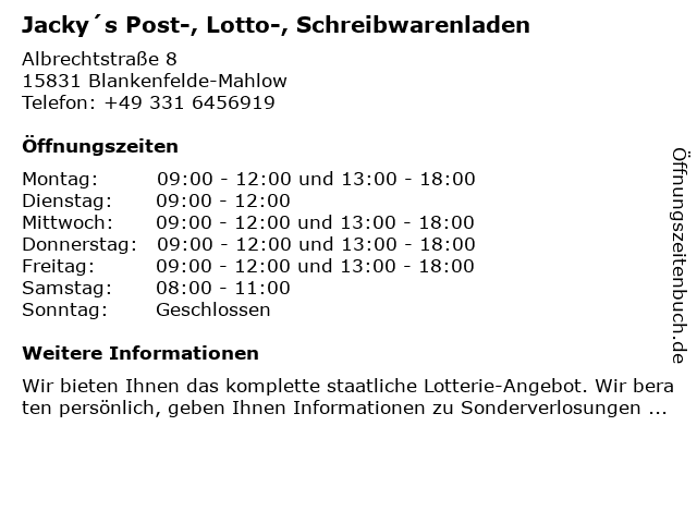 Branchen & Suchbegriffe zu Jacky´s Post-, Lotto-, Schreibwarenladen:dhl, jacky´s, lotto, post, schreibwarenladen |