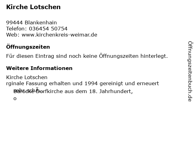 | Öffnungszeiten Kirche Lotschen in Blankenhain anzeigen | |