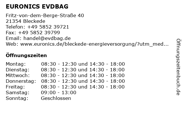 | Öffnungszeiten EURONICS EVDBAG in Bleckede anzeigen | |