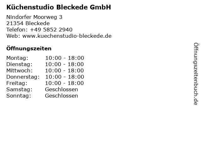 | Öffnungszeiten Küchenstudio Bleckede GmbH in Bleckede anzeigen | |