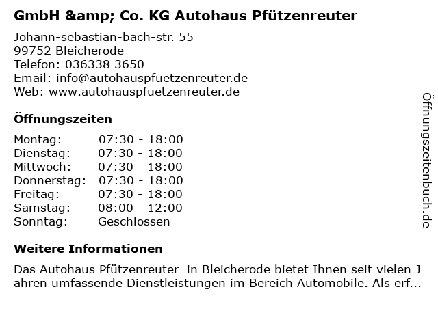 1 Autohaus Pfützenreuter GmbH & Co. KG (Entfernung: 0,00 km) Johann-Sebastian-Bach-Str. 55, 99752 Bleicherode 4 Schreinerei-Fenster-Türenbau, Inh. Thomas Pfützenreuter (Entfernung: 6,26 km) Hinter den Höfen 70, 99759 Sollstedt 6 Egbert Pfützenreuter Fliesenlegermeister (Entfernung: 13,72 km) Bernteröder Str. 12, 37355 Niederorschel |